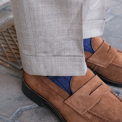しっかりしたテーパードと裾のダブルがビジネスにもカジュアルにも対応します。