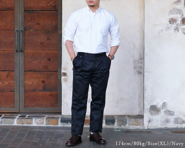 ワタリ幅だけでなく裾幅も広くとられており、まさにクラシカルなチノパンのスタイルを体現しています。