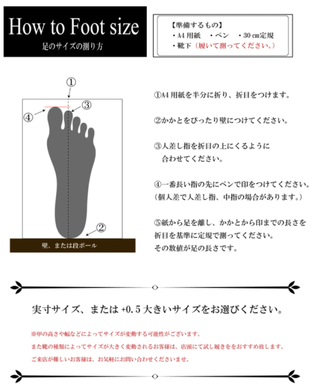 | 取り扱いサイズ | ・6H (24.5cm) ・7 (25cm) ・7H (25.5cm) ・8 (26cm) ・8H (26.5cm) ・9 (27cm) ・9H (27.5cm) ・10 (28cm) ※HENRYと同じ木型を採用しておりますが、HENRYよりハーフサイズ またはワンサイズアップをおすすめします。 ※甲の高さや幅などによってサイズが変動する可能性がございます。 |
