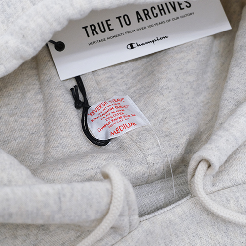 「REVERSE WEAVE」と「EXPANSION GUSSET(エクスパンションガゼット)」のパテントナンバーを表記した襟ネームも忠実に再現しています。