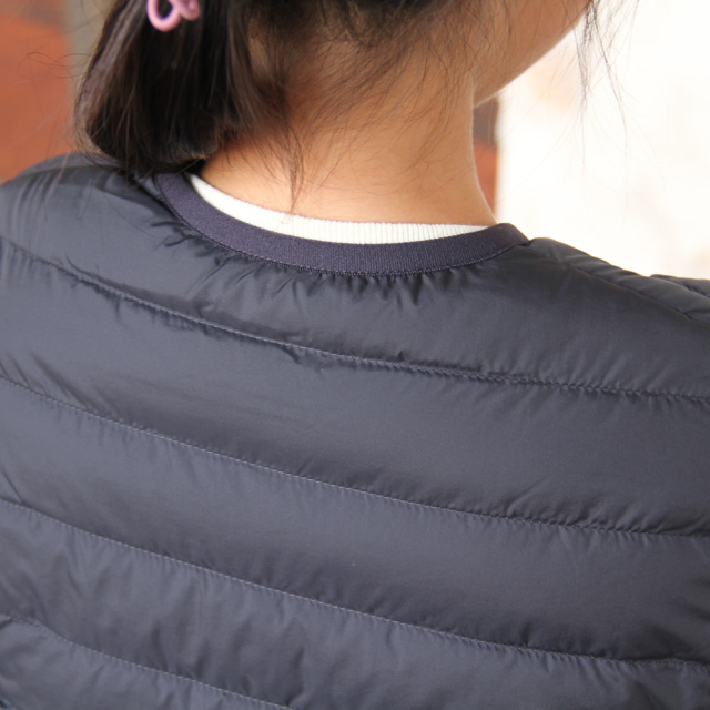 高密度ナイロンタフタを使用したクルーネックインナーダウンジャケット。