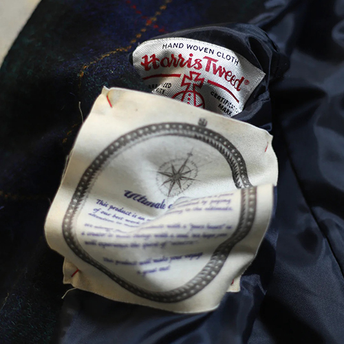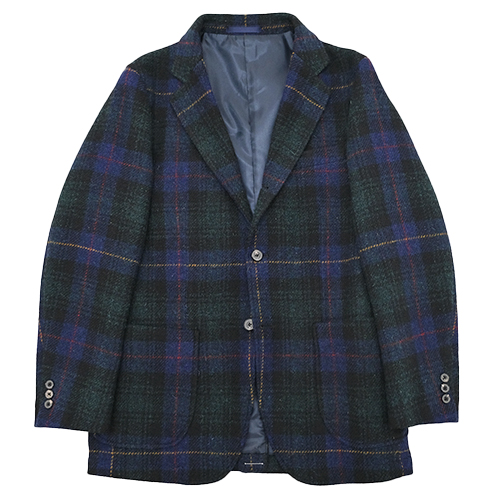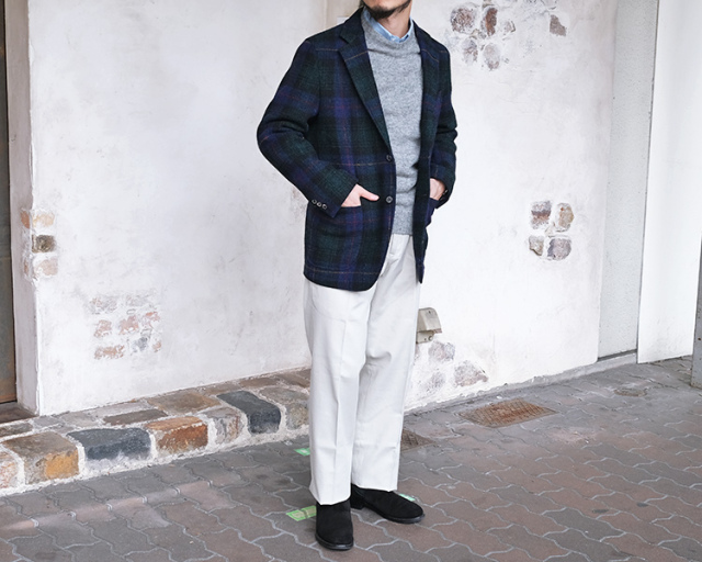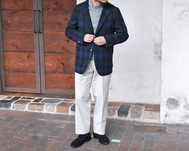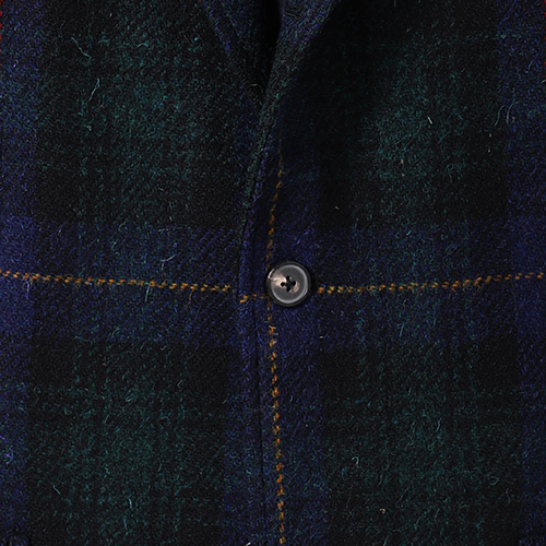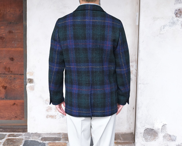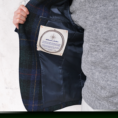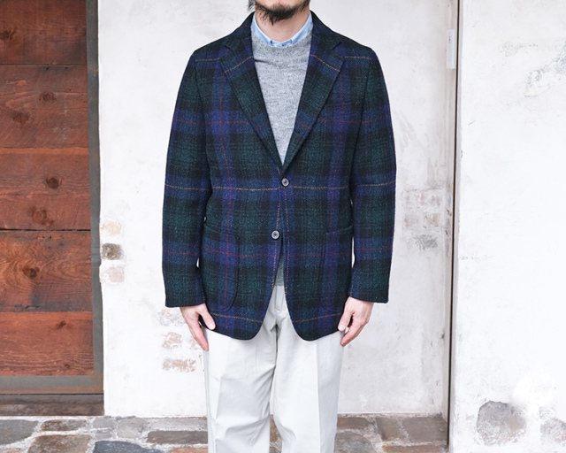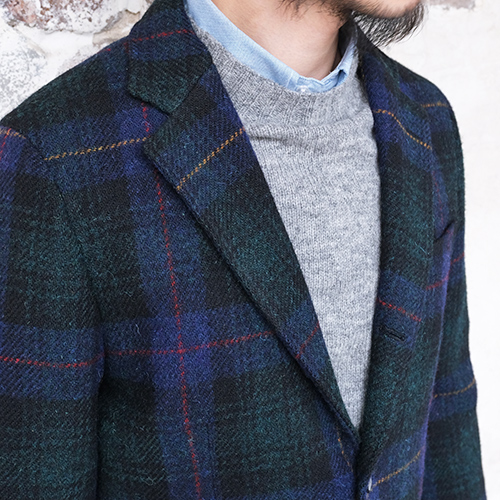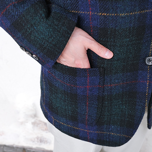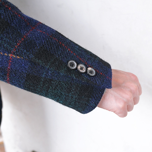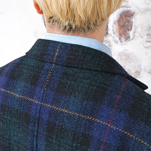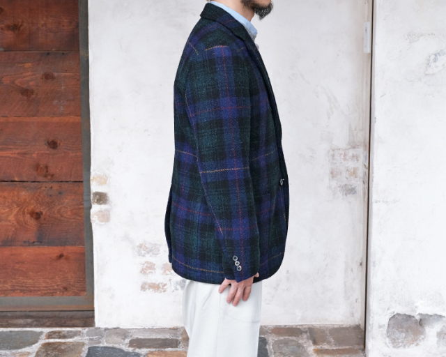 まず、素材にはイギリス北西部で織られた伝統的なHarris Tweedを用いながら、その色柄はアメリカントラディショナルに通じる鮮やかな発色を選び取りました。ヨーロッパで培われた生地の重厚さと、アメリカらしい軽快で開放的なムードが交差する素材です。