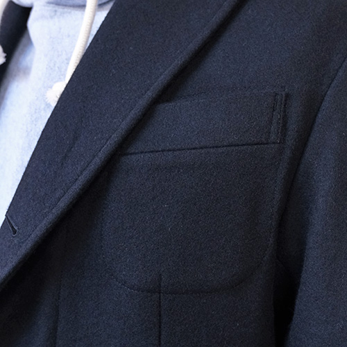 対して、ややゆるめにとった運針幅、ヘムから若干スパンのあるラペルのステッチライン、
