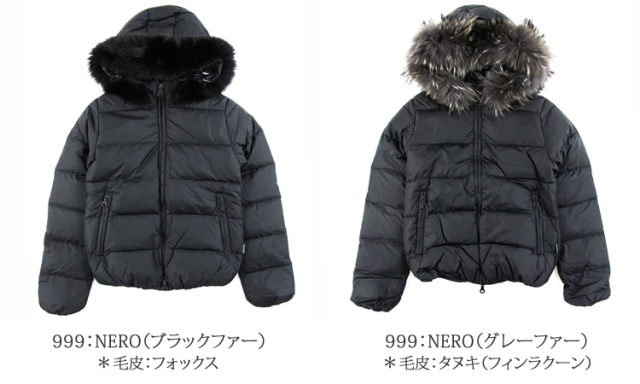 | 素材 | 表地:ナイロン100% 裏地:ナイロン100% 詰物:ダウン93%,フェザー7% 毛皮:999:NERO(ブラックファー):フォックス、999:NERO(グレーファー):タヌキ(フィンラクーン) |