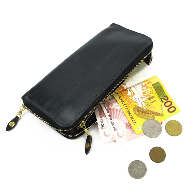 性別問わず使い勝手の良い、ジップラウンド型の長財布が入荷。中央にはファスナー付の小銭入れ。マチがしっかり取られたメインポケットには、なんと通帳も収納可能。またカードも左右合わせて12枚収納することができます。さらにカードケースの後ろにはレシートやチケット等を収納出来るサブポケットが付いています。オンオフ共に使用出来るシックでシンプルなデザインなお財布です。