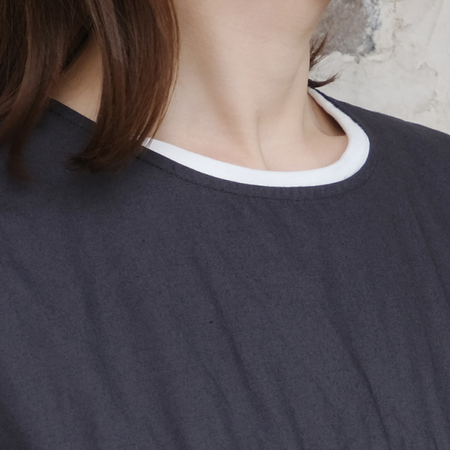 | 首元はスッキリとしたデザイン。 | Tシャツとも合わせやすい |