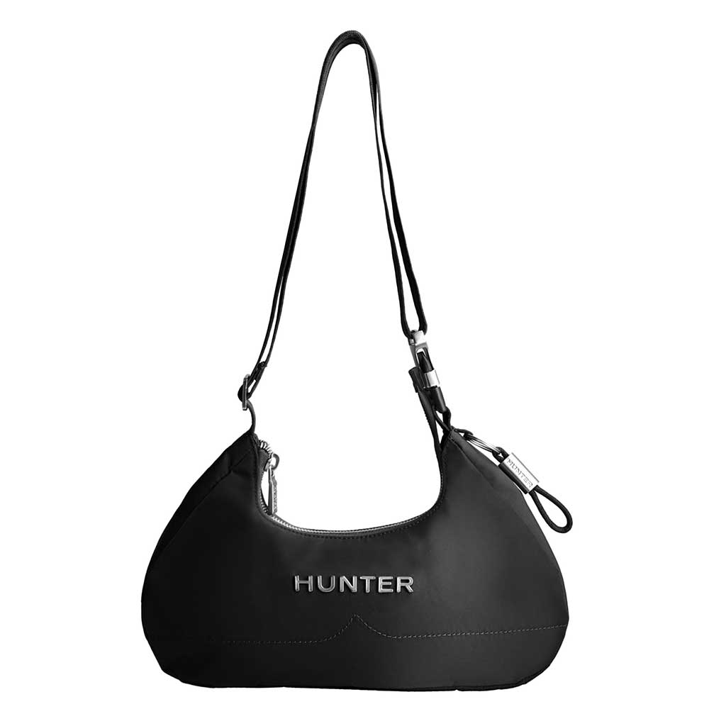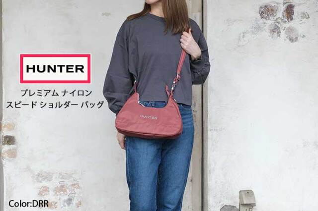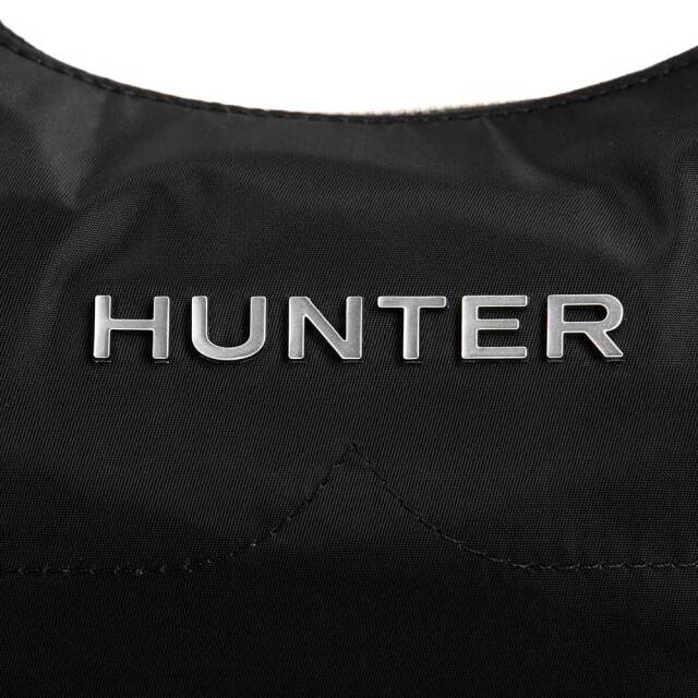 光沢感のある耐水性ナイロン生地とメタル製Hunterロゴが特徴の、
