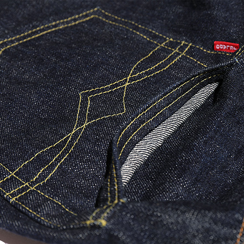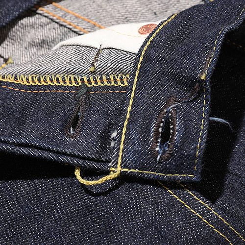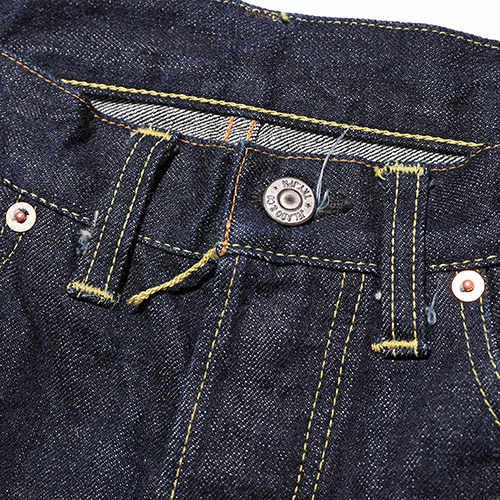 片面レーヨンタブ、銅ずくのオリジナルリベット、革パッチはホースレザーを