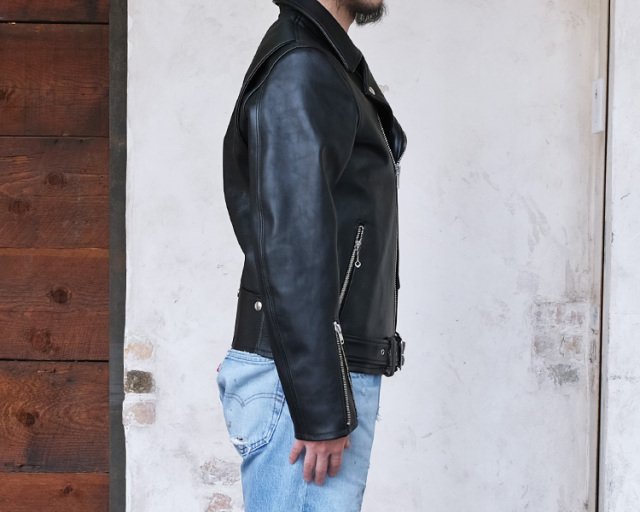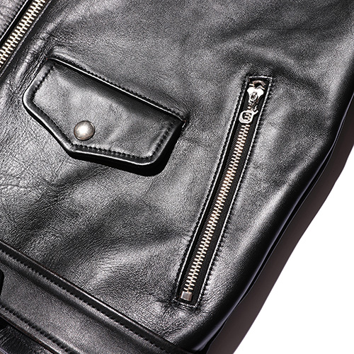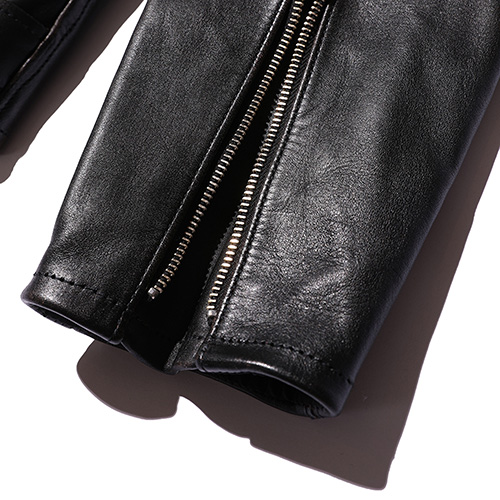 今回はよりシンプルなライダースにするため、エポレットを排除し、裏地もキルティングではなく、黒のキュプラで春でも着れるレザージャケットに仕立てました。キルトがない分ふくらみのない、よりスタイリッシュなレザージャケットに仕上がりました。