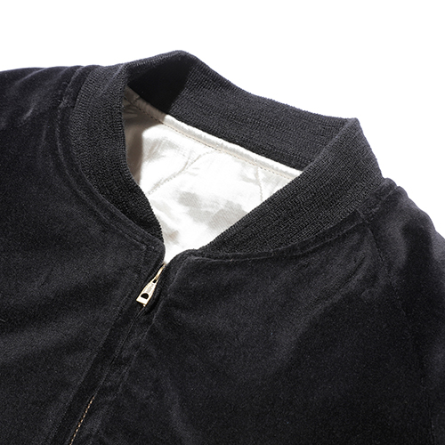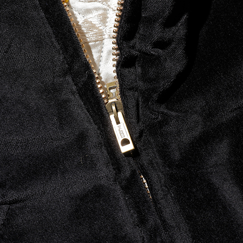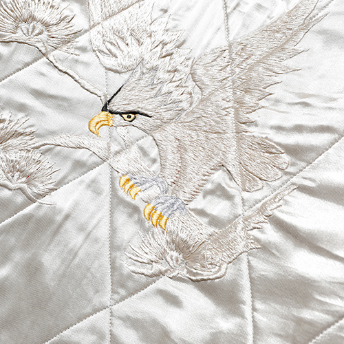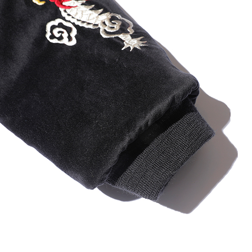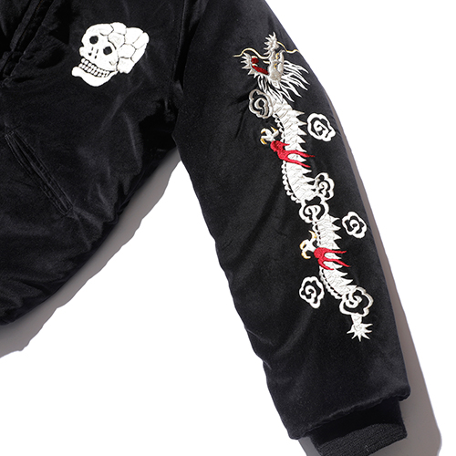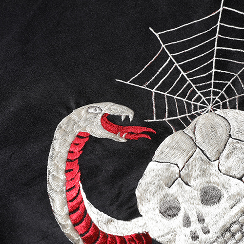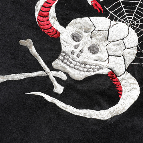 A面は綿100%の別珍生地を使用し、スカル&スネークのモチーフを刺繍。B面はレーヨンサテンに鷹の刺繍を施しました。