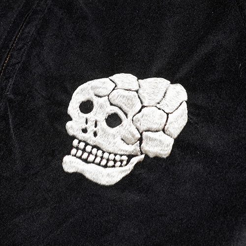 元ネタのスカルモチーフのスカジャンは、当時「つるしのお土産」として販売されていましたが、龍・鷹・虎などの定番モチーフに比べ人気がなく、生産数も圧倒的に少なかったため、現存する個体は極めてレア。