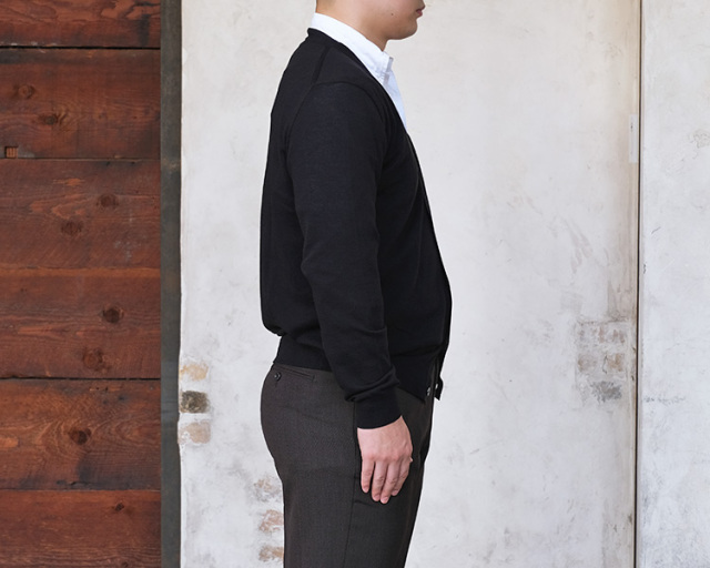 編み組織は12ゲージの天竺編み。目を詰めて編み上げることで上品な雰囲気を纏っています。