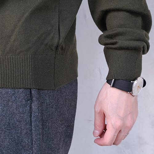 程よく締めた裾リブは収まりがよく、ジャケットとの相性も抜群です。