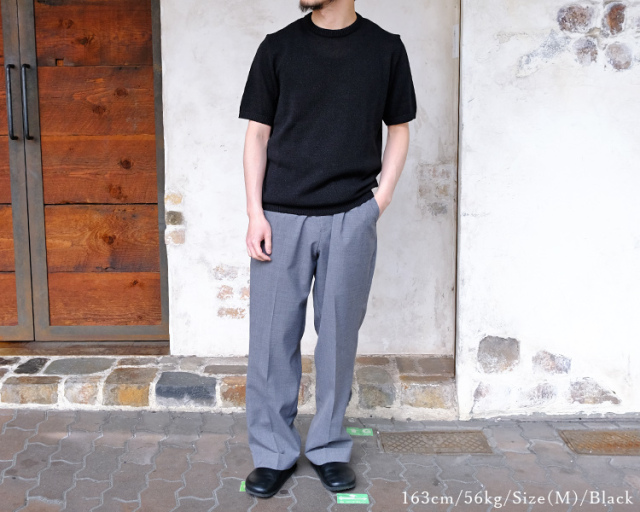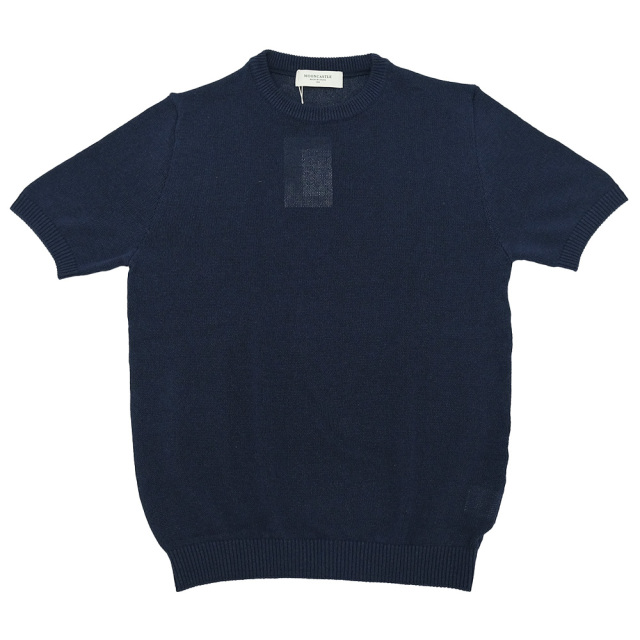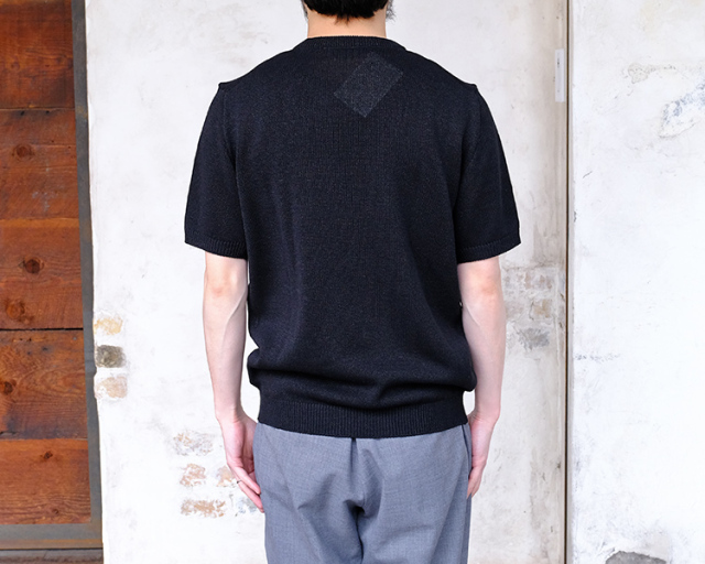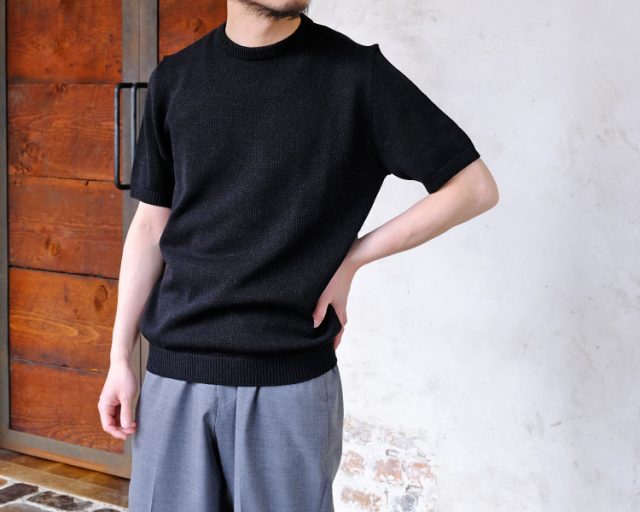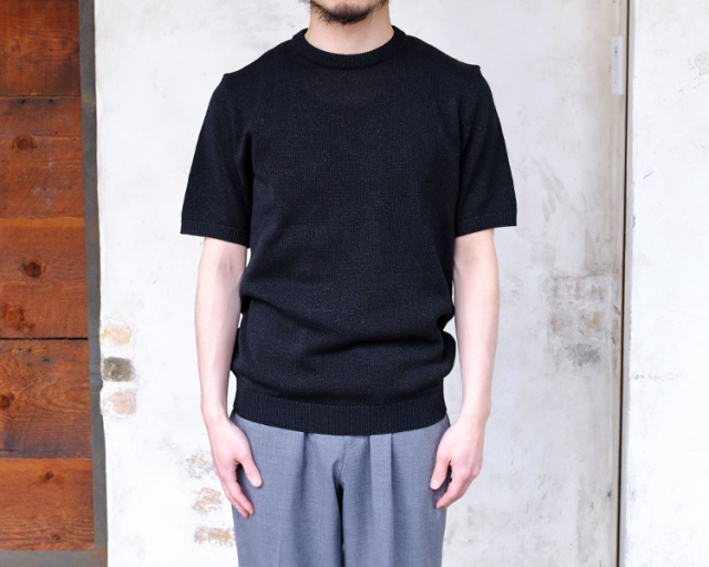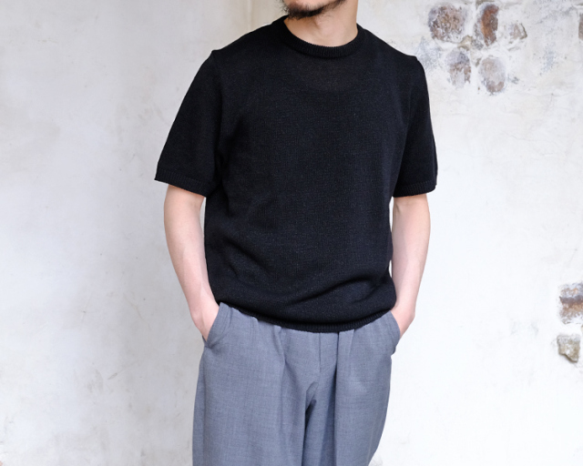 ムーンキャッスルのサマーニット。 形はクルーネック仕様のショートスリーブ。 日本の伝統素材である美濃和紙と、シルクコットンをブレンドしたムーンキャッスルの新素材。 7ゲージで編まれた程よく通気性のある生地は、和紙のシャリっとした独特の質感を持ち、夏にもピッタリなサマーセーターに仕上がっています。 日常使いからリゾートまで、涼しさと上品さを兼ね備えた一着として、幅広く活躍します。