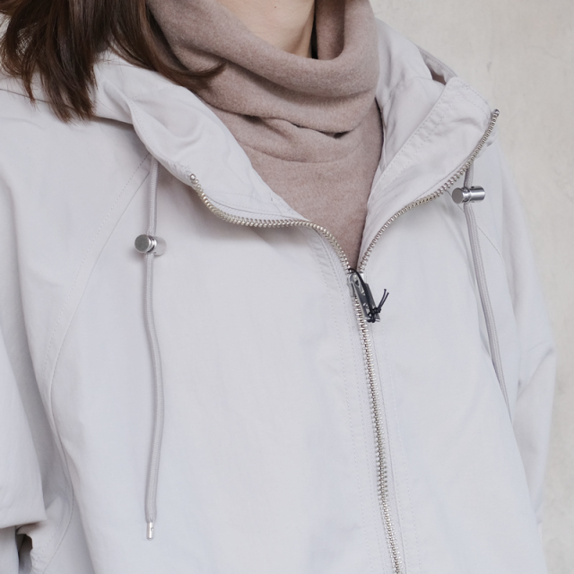 | 手首のスナップボタンで | 大きなフードが後ろ姿のアクセントに! |