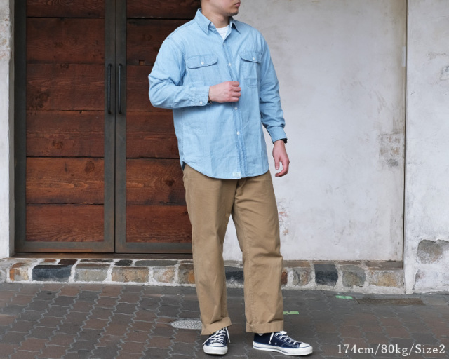 全体的にゆったりめのシルエットが80~90年代のアメリカのワークシャツの雰囲気を醸し出しています。