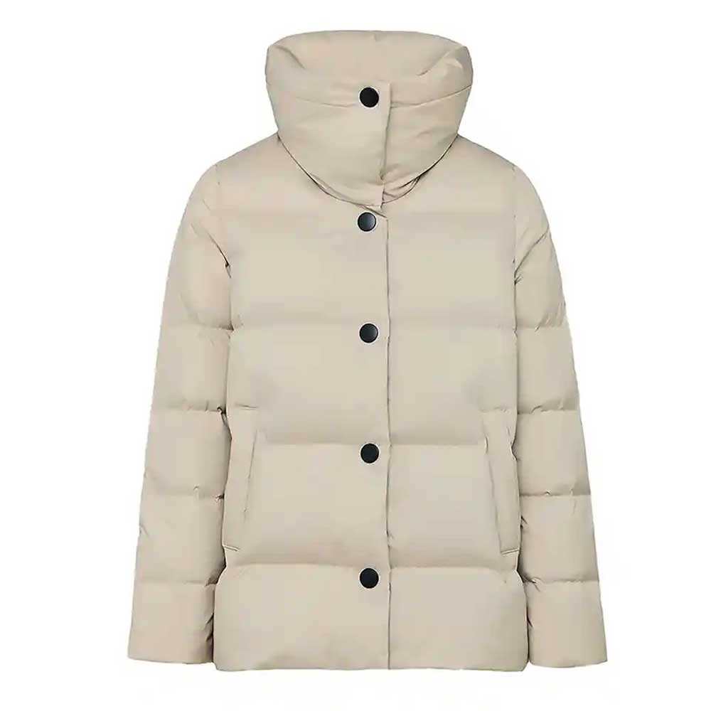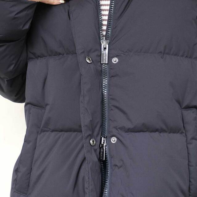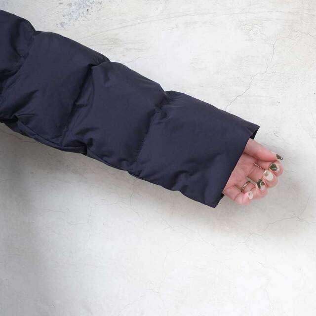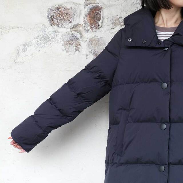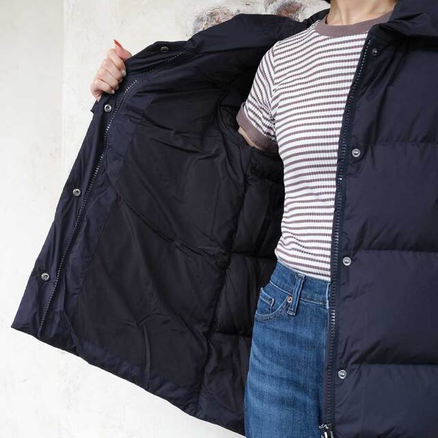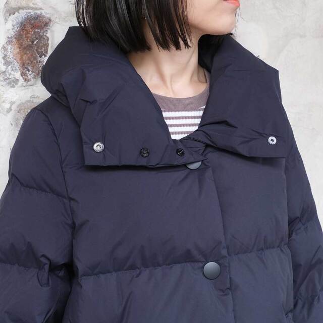 前後差を付けた裾をラウンドさせ、全体的に柔らかい印象のダウンジャケット。