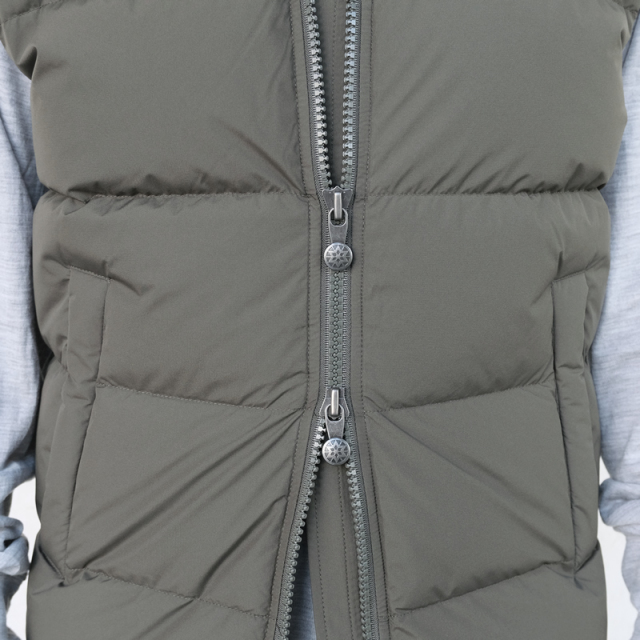 | 細部までダウンが詰められたフードは、 | フロントジップは上下から開閉可能な |