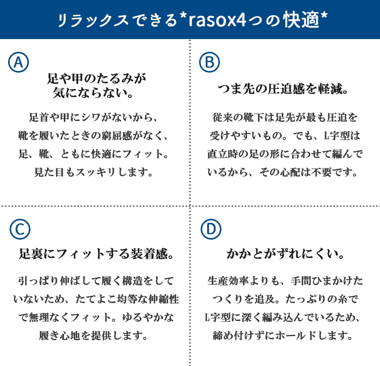 L字型ソックスで有名なrasox(ラソックス)から