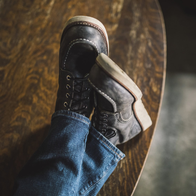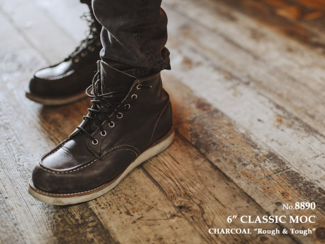 | #8890に使用されているレザーは、黒に近いグレーカラーのチャコール・ラフアンドタフです。銀面(革の表面)をわずかに擦って加工し、オイルとワックスを加えたヌバック・レザーの一種で、独特のムラ感と靴の仕上げ段階で加えられるシワ感を持っています。このレザーでつくられたブーツは、最初から履き込まれたブーツのような深みのある味わいを持っています。 |