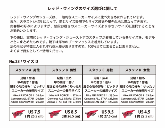 足幅の広めな方は上記サイズ換算表よりもワンサイズ大きいサイズを選ばれた方がいい場合がございます。 はじめはジャストサイズ~横幅ややキツメ、くらいで合わせていただくと、履き込んでいくうちに丁度いいサイズになると思います。 |