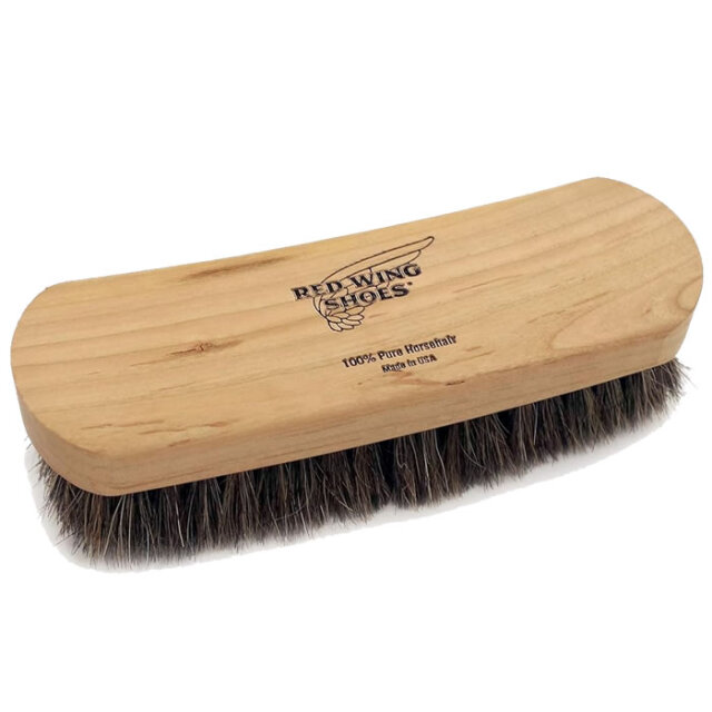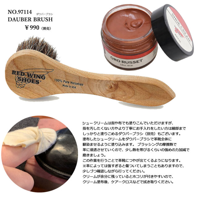 | 3.ブーツクリームを指または、柔らかい布、ダウバーブラシなどで全体的に伸ばしながら塗りこんでいきます。色が薄くなっている箇所は市販の補色剤を塗り込んだ後にブーツクリームでならしてください。なお、ニュートラル以外のカラーは補色としても使えます。ただし、ステッチ等にも色がつきますので、気をつけてご使用ください。 ※ブーツクリームのニュートラルは透明ですので、アッパーレザー以外にコバにも塗り込んでおくと全体的にきれいに仕上がります。 4.ブーツクリームが乾燥しないうちにブラシでしっかりブラッシング。余分はブーツクリームはホコリがついたり、革の劣化の原因にもなりますので、柔らかい布で取り除いて下さい。なお、ニュートラル以外の色付きのクリームでお手入れする場合、ブラシでブラッシングするとステッチ等に色がつきますので、柔らかい布で丁寧に拭き取るのがおススメです。特にステッチ等の色がつく辺りは布のきれいなところで磨いて下さい。 |