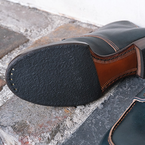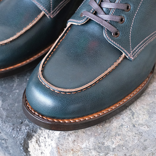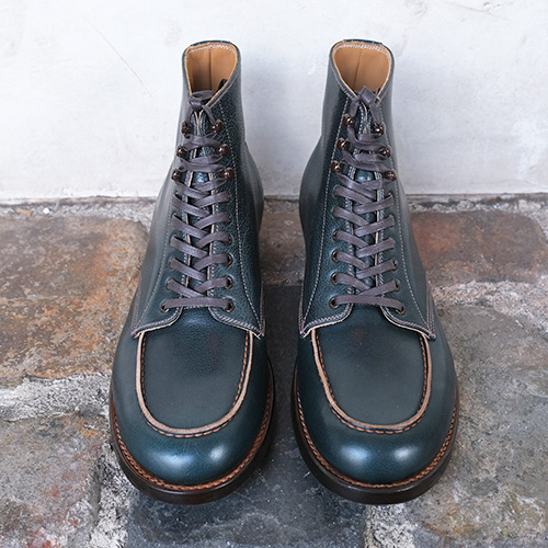 レザーは穏やかな艶を持つ深い青緑色のキップです。キップは仔牛(カーフ)と成牛(ステア)の間の若い牛の革で、キメが細かくしなやかな革。このキップをシュリンク(収縮)させることで、肌に細かなシボが生まれます。型押しとは違って自然に生じるシボなので、その出方は革の部位によって違い、比較的スムーズなところや、シボが強めに入るところがあります。ブーツによって革の肌目に若干の個体差が出ますが、どれもが素晴らしい風合いです。