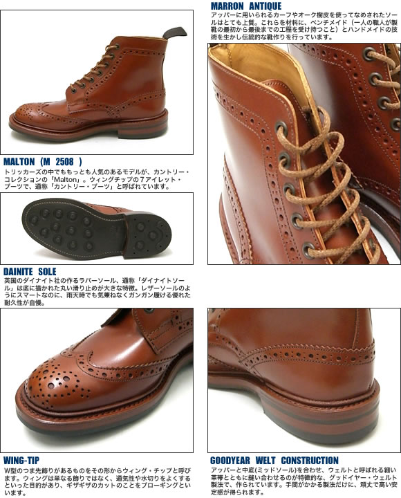 | 詳細説明 | 靴作り名人と呼ばれた"Joseph Tricker"が1829年に創設したブランド。靴の聖地・ノーサンプトンしないで最も古い歴 史をもつシュー・メーカー。チャールズ皇太子もご愛用になることでも有名。創業当初からかわらない伝統的な製法で、良質かつ実用的な靴を作り続けています。 トリッカーズと言って真っ先の思い浮かぶのがカントリー・コレクション。ウィングチップの7アイレット・ブーツで通称「カントリー・ブーツ 」と呼ばれています。特徴はアッパーに施されたブローギングとレザーのダブルソール(グッドイヤーウェルト製法)。グッドイヤー・ウェルト製法で仕上られるダブル・ソ ールは、耐久性に富み、カントリー・ブーツだけに田舎道もガンガン歩けるぐらい頑丈。 また、アッパーに用いられるカーフやオーク樹皮を使ってなめされたソールはとても上質。 美しいトゥのウイングチップとメダリオン。存在感のあるガッチリとしたウェルト&ソール。すべてのパーツが完璧になおかつ調和されたことで 作り上げられた究極の一足です。 「Stow」(型番:M5634)と日本代理店別注の「Malton」(型番:M2508)との違いは以下をご参照ください。 |