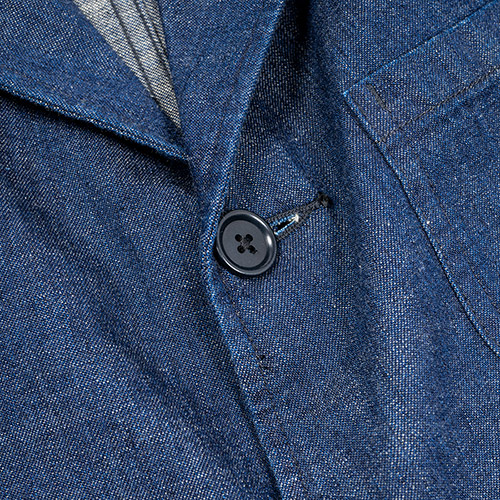 デニムはヨコ糸がグレーにうっすら染まったものを使っています。通常の、ヨコ糸が綿の色そのままと違い、全体的に落ち着いたくらいトーン。少しこの落ち着いたトーンのほうが、セットアップのジャケット・トラウザーズには合うだろうという事です。が、当然、糸を染めてる分コストが高い。だから、チノより少しお値段が高いのです。
