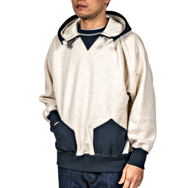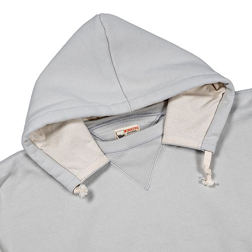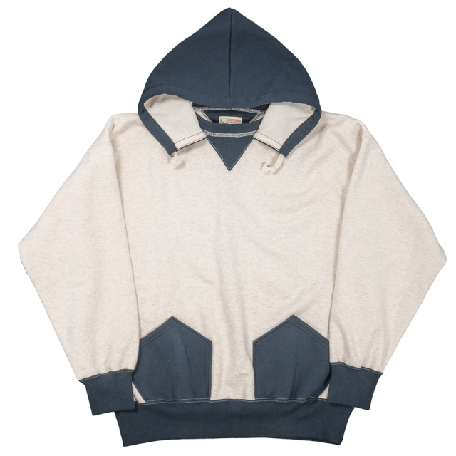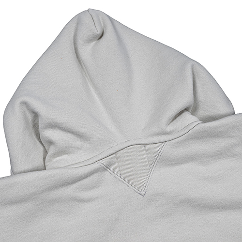 ビンテージを色々見ていたら発見した仕様。おそらく、フード裏までボディと同じ裏毛だと厚みがありすぎて洗濯したと き本当に乾きが悪い。そのあたりを解消するためにフード裏だけは別生地にしたのだと想像しています。