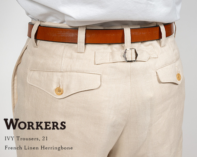 プレインフロント(前にタック無)、サイドの縫い目利用ポケット。バックシンチにフラップ付き玉縁ポケット。これでもかと「アイビー」らしい仕様を盛り込みました。 でもフロントはボタンフライにしてしまうのがWORKERSらしい。やはりクラシックな仕様が好きなのです。