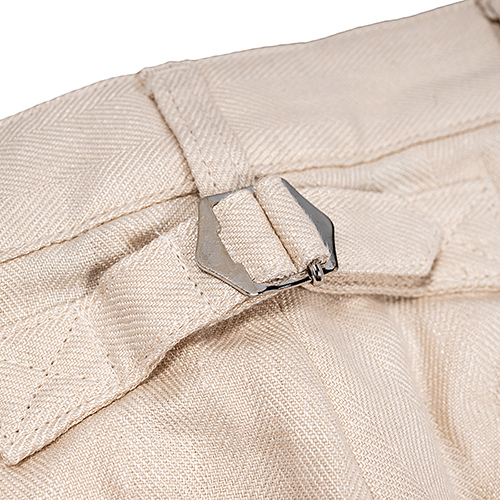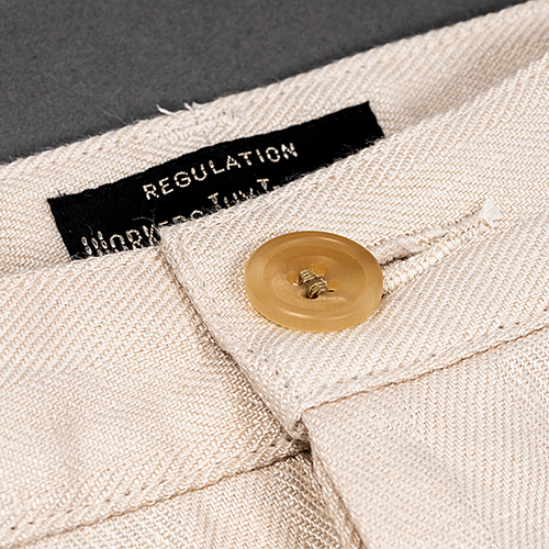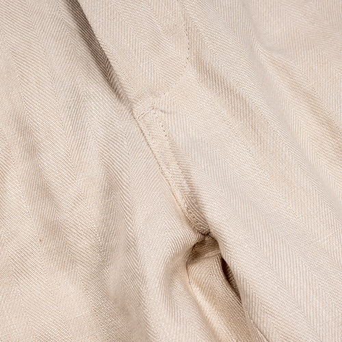 | 素材 | 7.5オンス フランスノルマンディー地方産リネン100%、ヘリンボーン 【附属】 本水牛ボタン 【縫製】 ポリエステルスパン糸 |