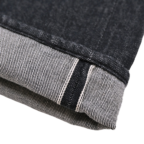 数年前、たまたま見たコーディネートでブラックジーンズ+ハイネックニット+ジャケットがありました。それ以来「ブラックジーンズはジャケットに合うのではないか?」とアイデアを温めてきました。ただ、ブラックデニムは問題が一つ。 ホワイトデニムと同じく、(1)糸を染める (2)染めた糸を織り機にかかるよう巻くため別の場所に持っていく。この時も小分けに巻きなおす (3)別の場所で織機にかかる状態にする(サイジングという工程)、これらの工程を別々の場所で行う のでインディゴデニム以上にコストがかかる。莫大な量があれば、インディゴデニムと同じ「ロープ染色」という上記三工程を一つの工場で行う方法もあります。生地屋さんが莫大な量を作ってコストを抑えたブラックデニムを使うことも頭をよぎりましたが、それではWORKERSのブラックデニムに成らない。初志貫徹、メーター単価が高くてもWORKERSの糸を使ってブラックデニムを作りました。(価格はもう無理やりです)ブラックデニム、OWではあまりインディゴと差がわかりません。そこで、加工物を追加。これで、セルビッジのがたがたとしたアタリが良くわかります。ミミ付デニムでこその色落ち。縮み・捻じれに対する加工をしていない、毛焼きも無い生機(キバタ)生地。ステッチ部分に出たデコボコ、捻じれた脇の縫い目がポイントです。