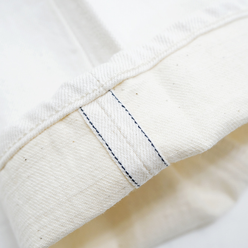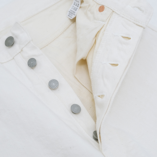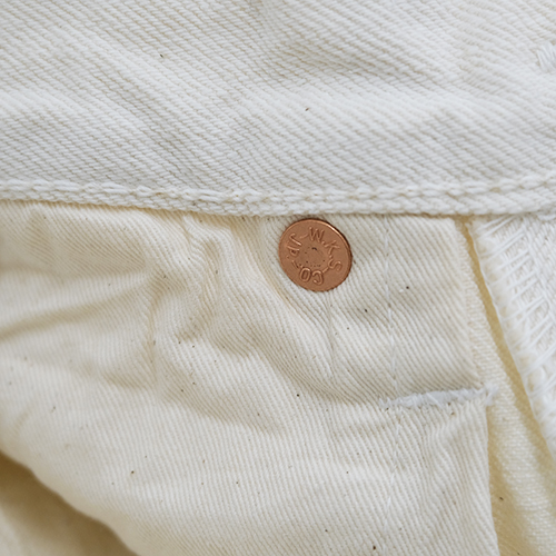 | 素材 | 13.75オンス、米綿100%、ホワイトデニム 【附属】 刻印入りタックボタン、リベット、移染防止革ラベル 【縫製】 主要部綿糸・一部、環縫いの下糸はコア (中心部に強度のある化学繊維糸に綿糸を外部に巻いた糸)を使用 |