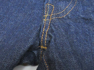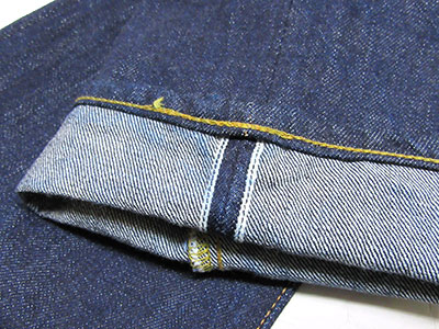 セルビッジはインディゴブルー。経糸と同じロープ染色した糸を入れています。 |