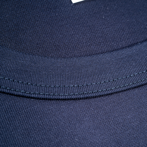 編み上がった生地をシルケット加工。アルカリ性の液体につけて表面をつるっとさせる。がっ しりして形崩れしづらい、かつ表面はつるっとしているので上にジャケットを着ても引っかからない。首のリブはがっしり厚い物にして、ボーダーの色部分が透けづらいように。