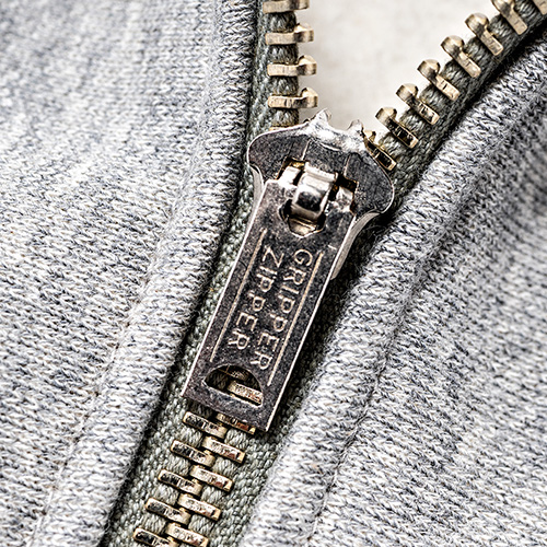理由は衿付け部分をミシンが乗り越える難しさ。現行品に使われるような、比較的薄い生地、ファスナーテープの幅も広いYKK ファスナーなら無理なく縫えます。が、これを極厚の綿100 スウェット生地、かつ巾のあまり広くない綿テープのビンテージ風ジッパーでやろうとすると大変。